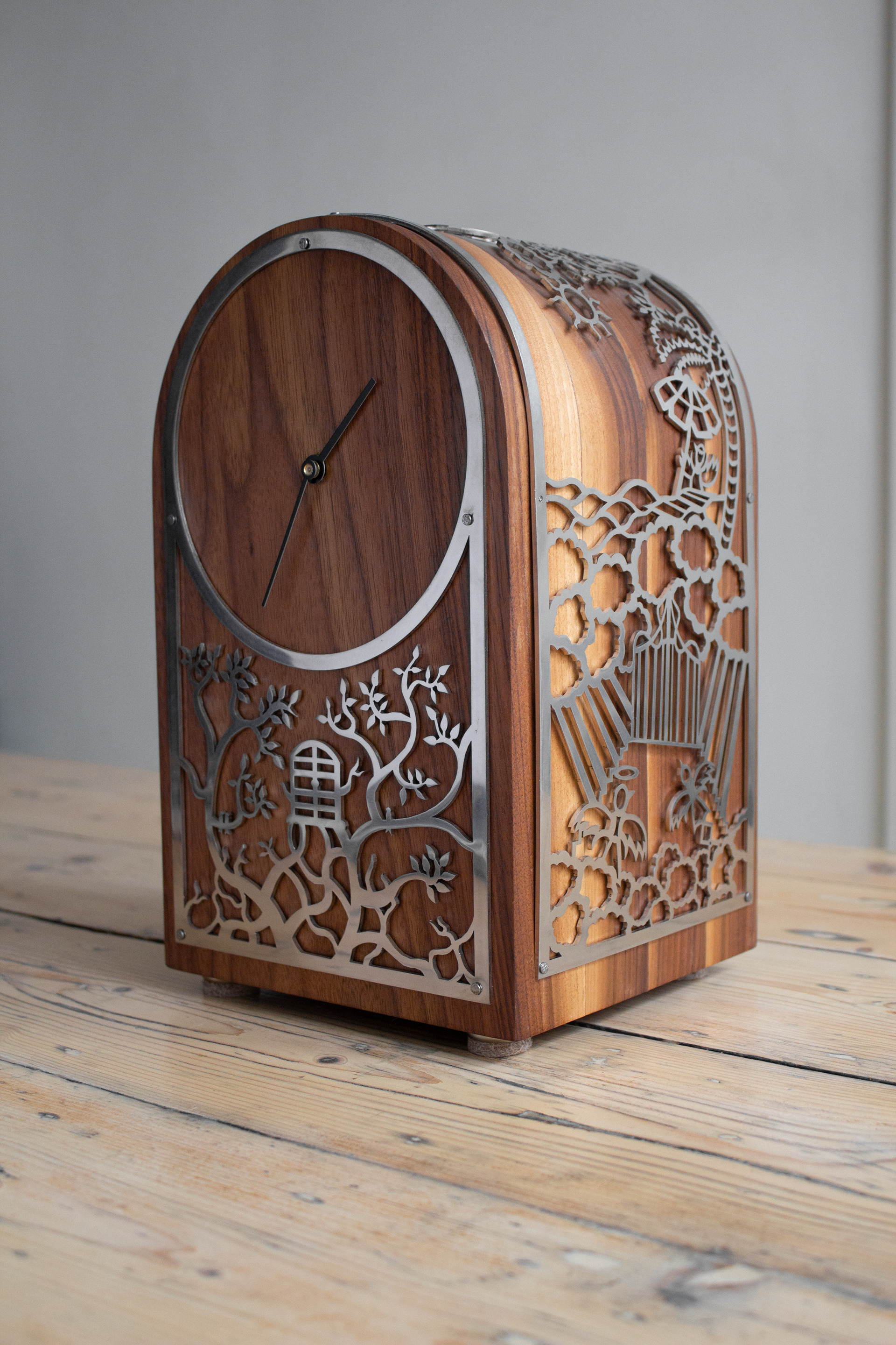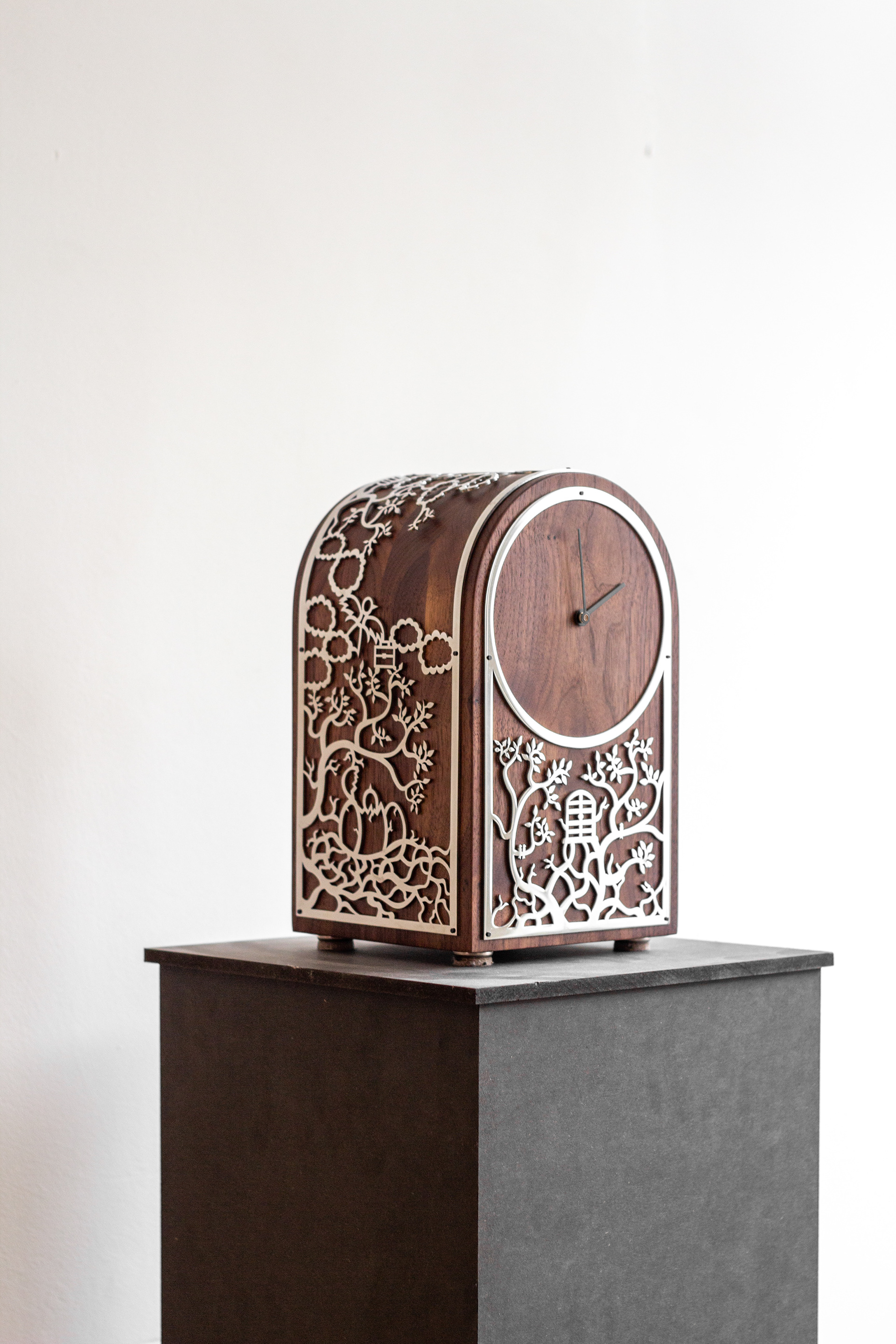 The clock is made out of pieces of massive walnut wood and lasercut stainless steel.